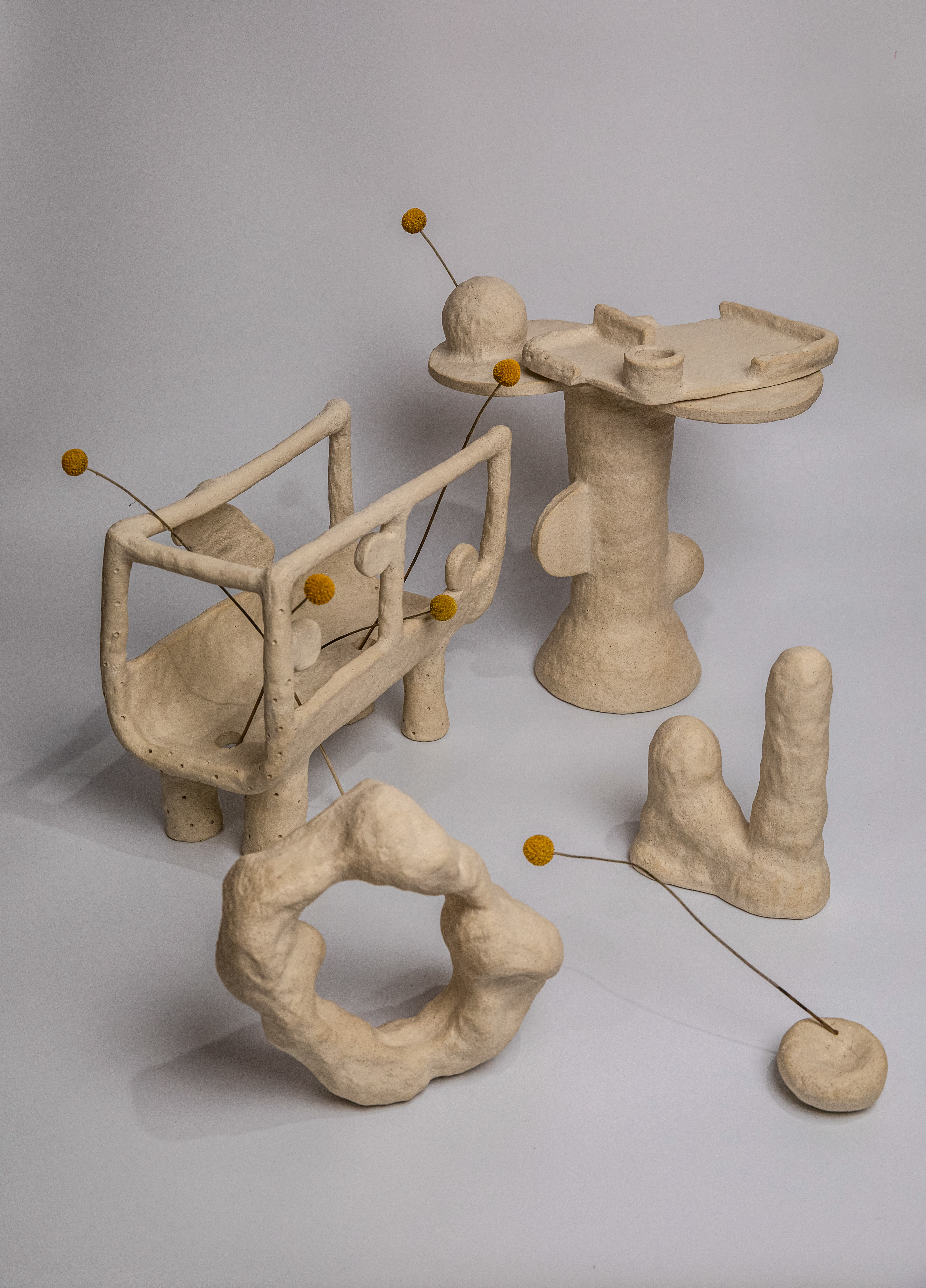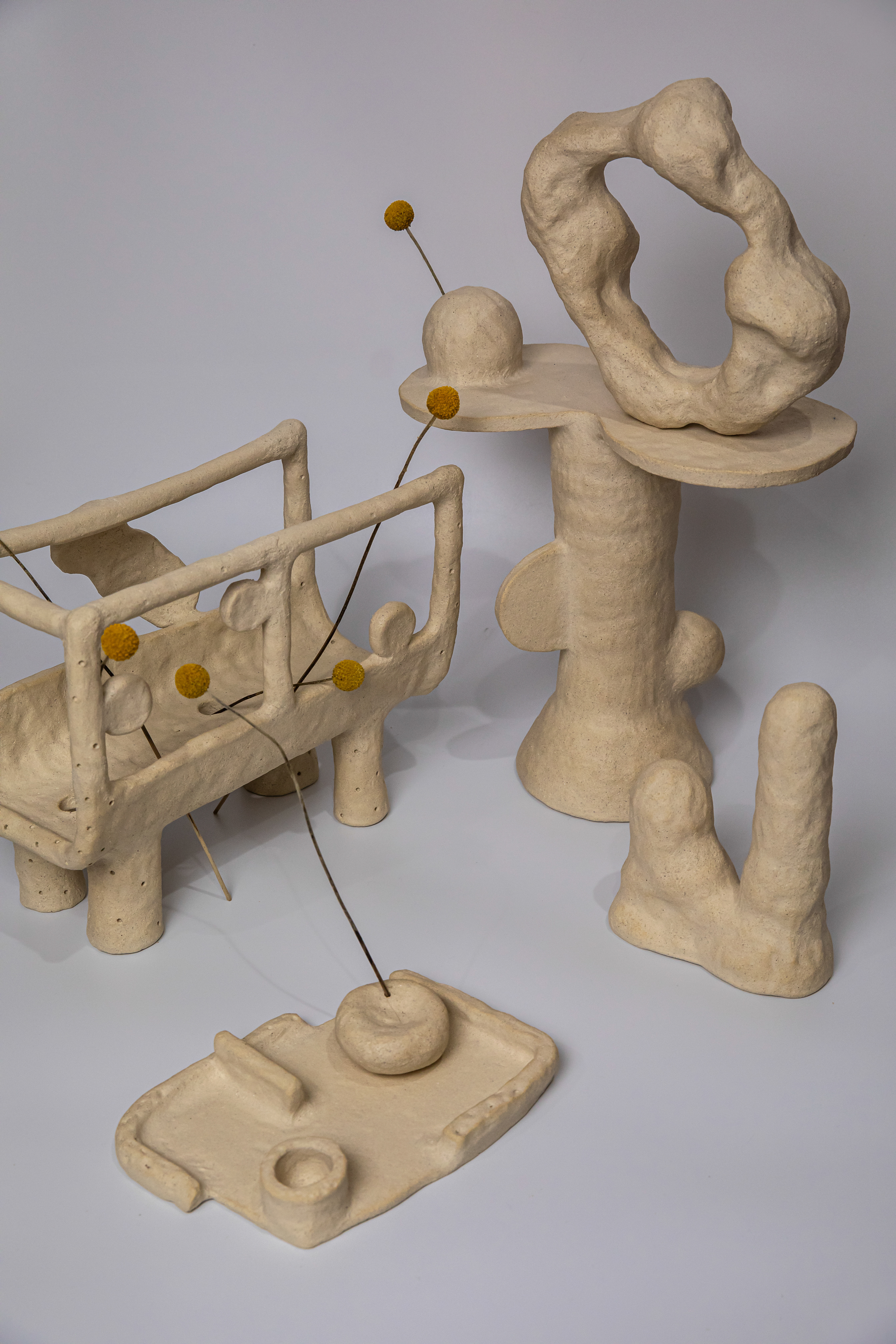 This series of unglazed ceramics and dry Craspedia are built to discover the origin of the clay and the relationship between the primitive power inside this material and its natural functionalities, therefore, to discuss the role that ceramic objects are playing in the home through the aspects of practicalness and uselessness.